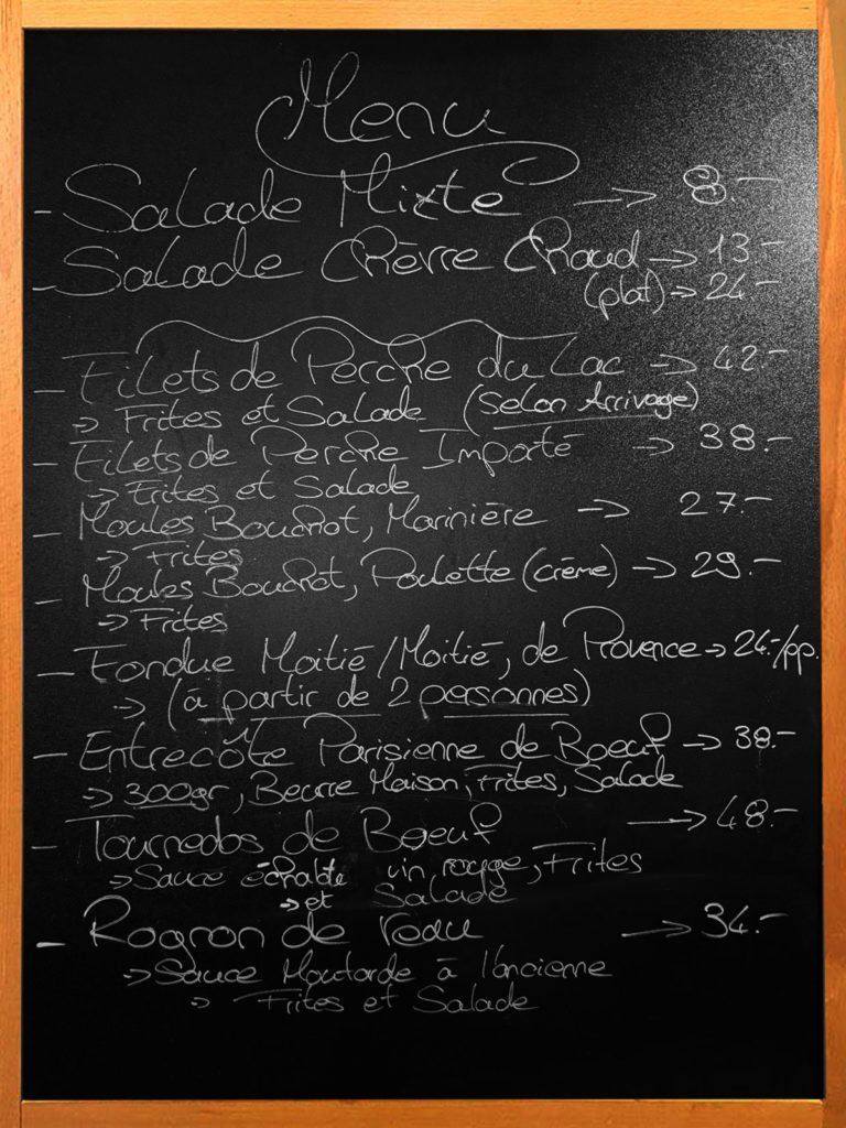 Retrouvez ici la carte des mets du restaurant.Réservez votre table en nous appelant au numéraux suivants. +41 32 835 15 20